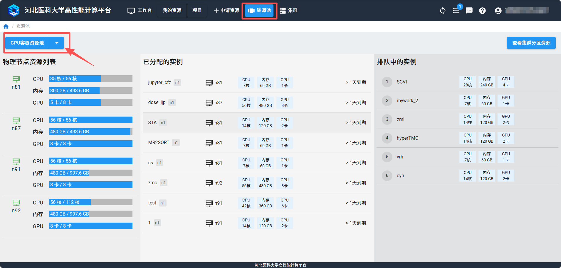 平台根据不同的资源或应用类型会将节点划分成不同的资源池中,比如hpc资源池中的所有节点用于hpc计算,GPU资源池中所有节点用于需要GPU卡计算的应用,等等。