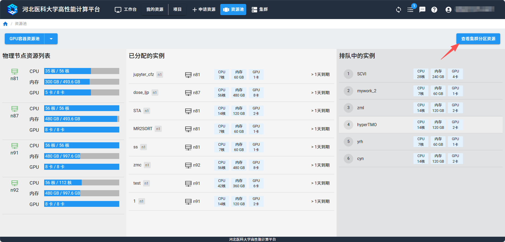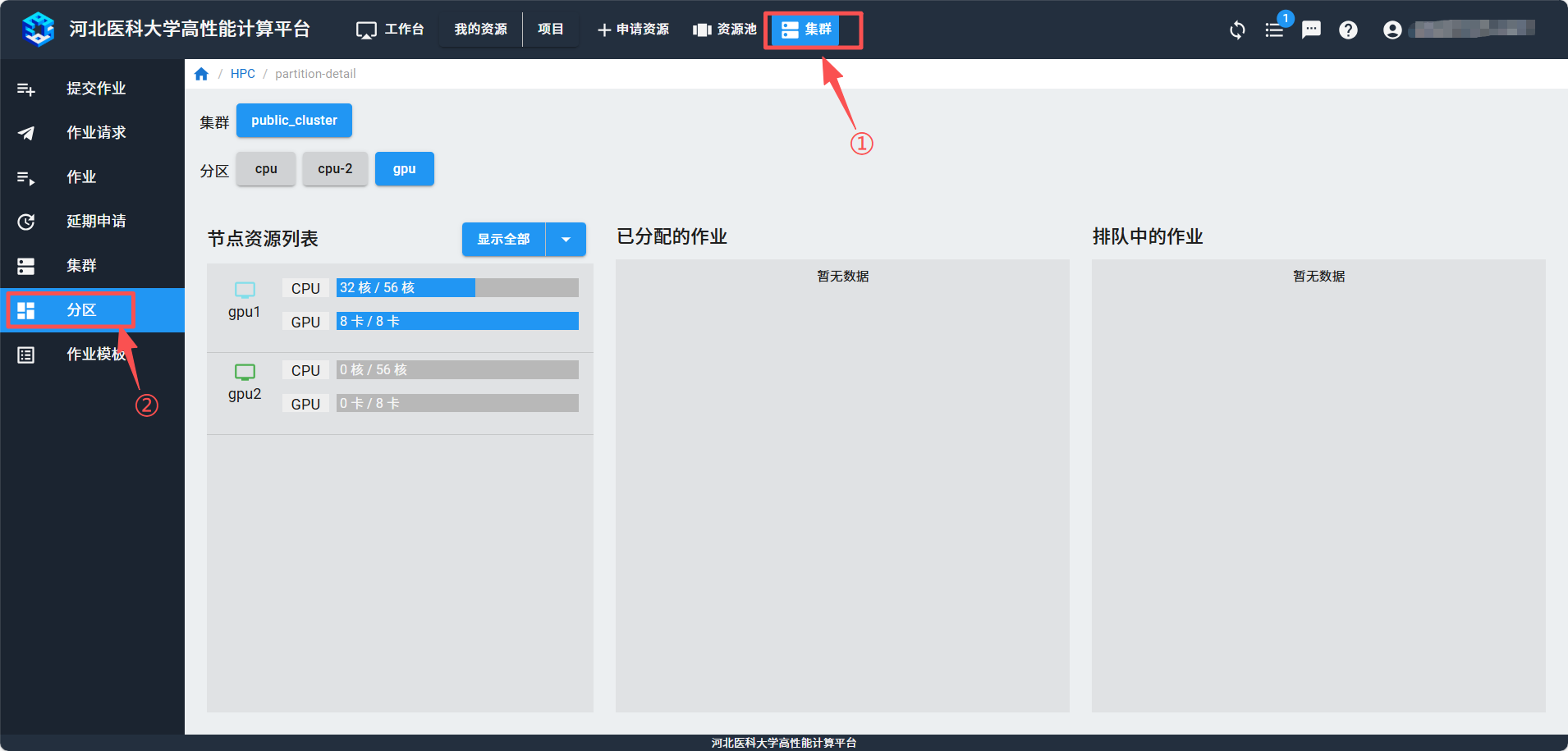 hpc资源池中会显示所有资源都已经占用,需要进入“集群”—“分区”页面查看详细排队情况。或是控制台或终端登录集群用squeue。