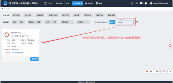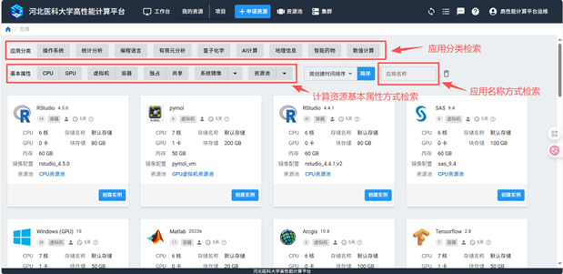 可根据应用分类、基本属性、应用名称的检索方式检索对应所需的计算资源