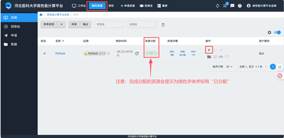 在“我的资源”中选择申请的实例,启动该实例。