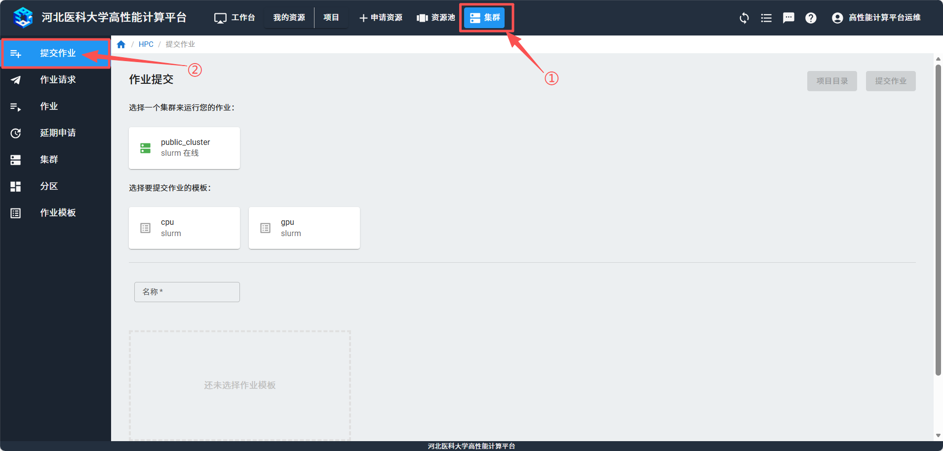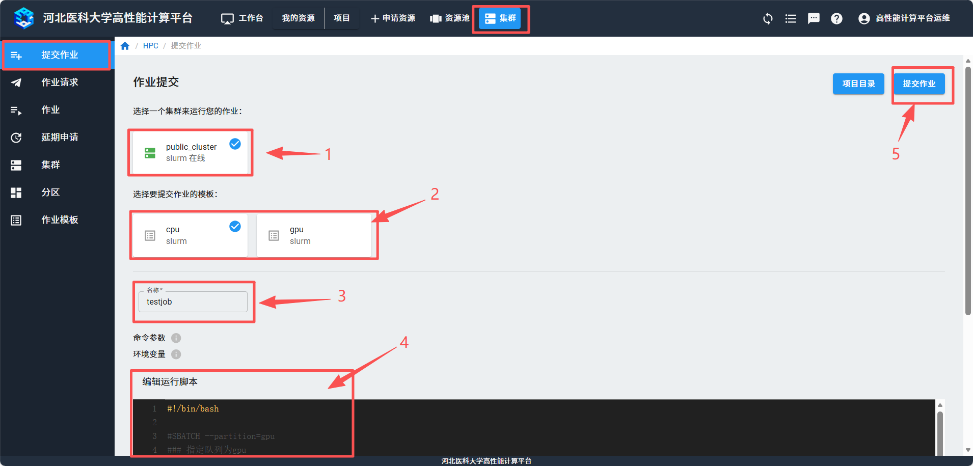 选择需要使用的集群和作业模板,填写作业名称,在脚本编辑器里填入作业脚本,点击右上方的“提交作业”按钮。