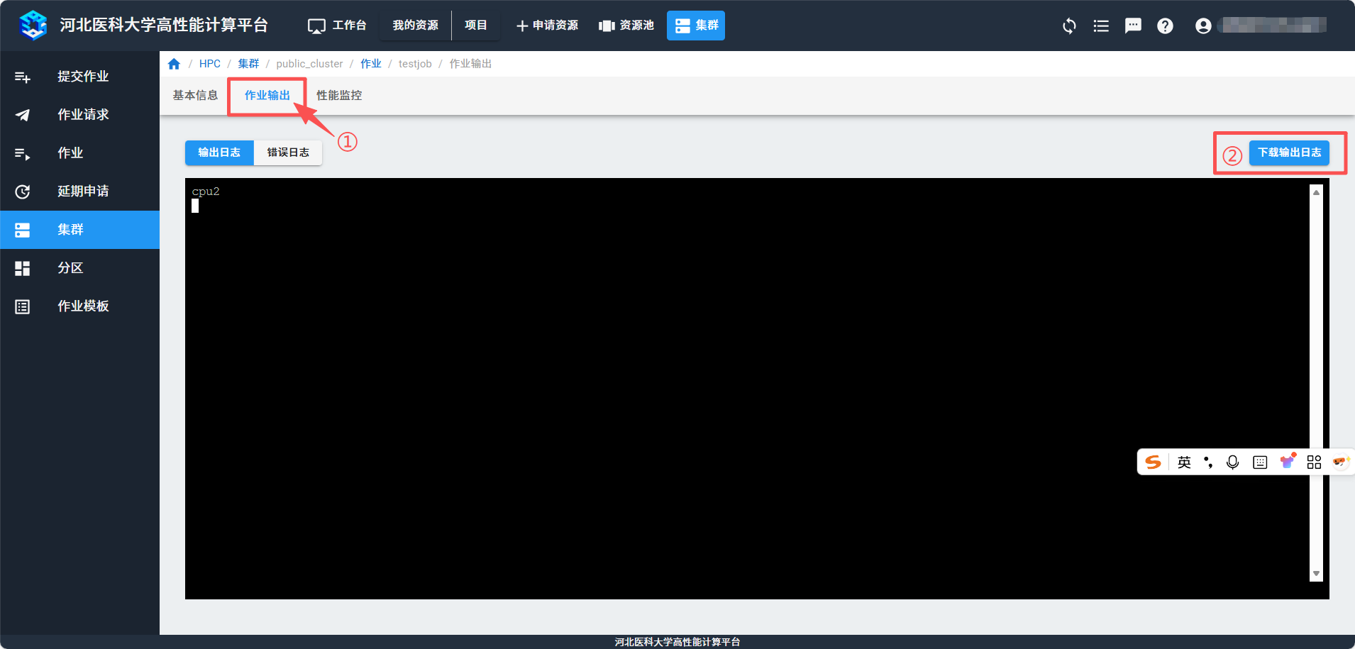 在“作业输出”页面,点击“下载输出日志”。