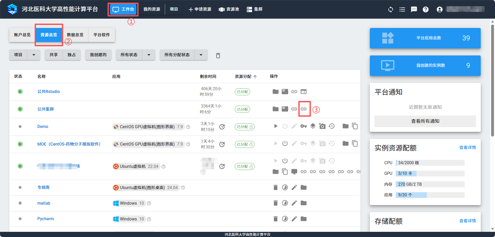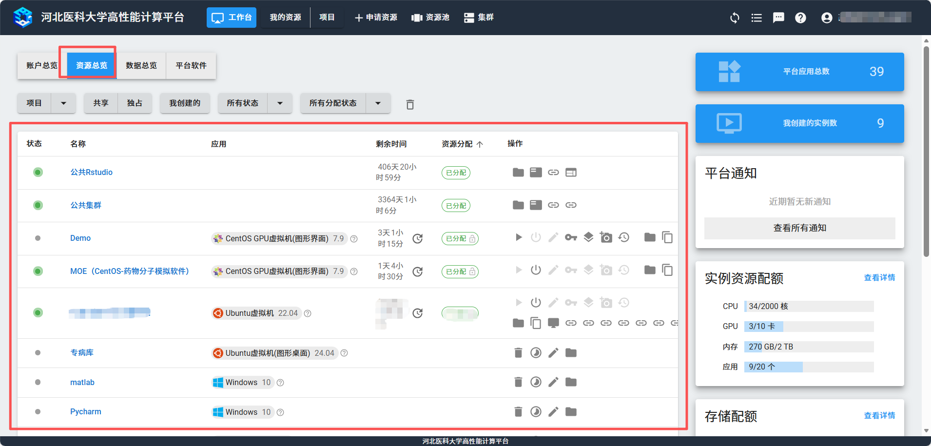 选择”工作台“-”资源总览“,可以看到平台提供的公共集群"public_cluster"。