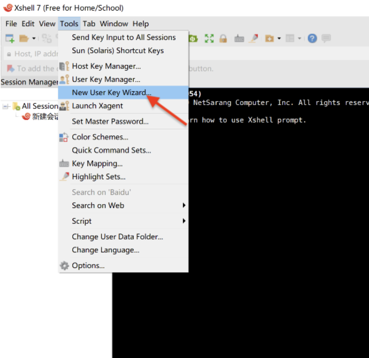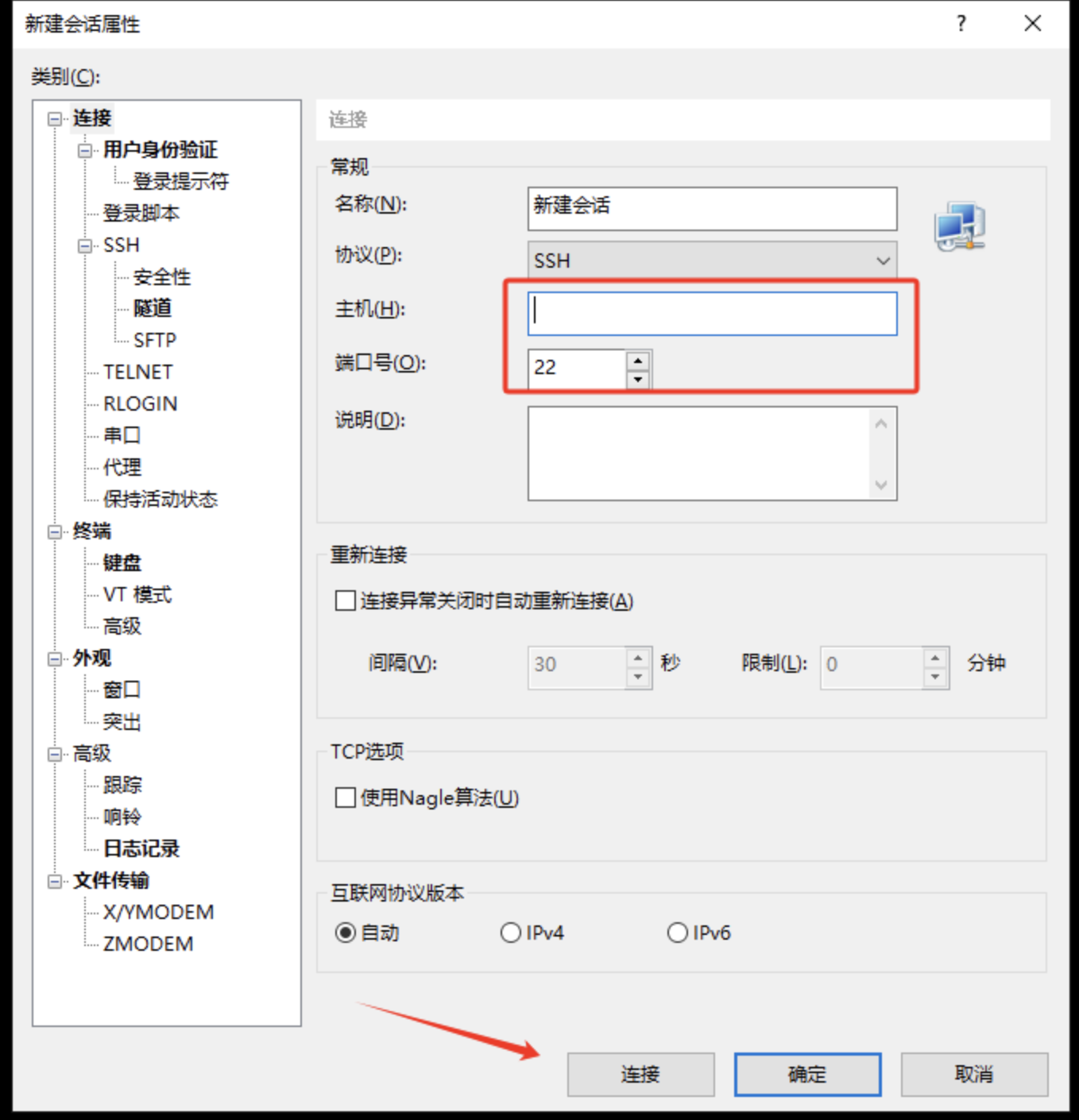 点击软件左上角新建会话属性,按照上文查看要登录的集群SSH IP和端口信息,输入SSH IP地址和端口后点击连接。