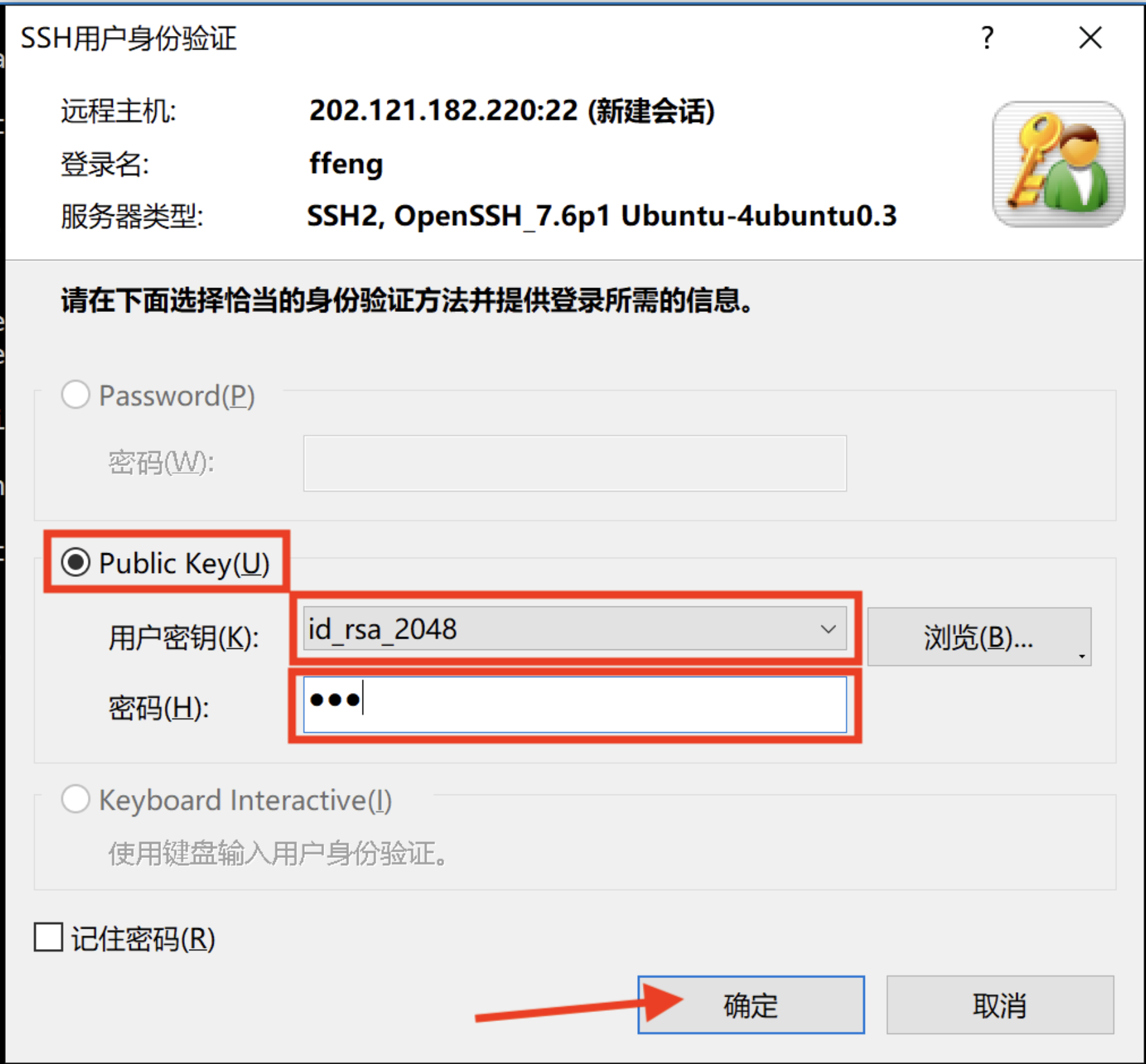 在用户身份验证界面选择“Public Key”,选择上文中保存在本地的公钥文件。如果之前在生成密钥对时设置了密钥密码,还需要一并输入密码。