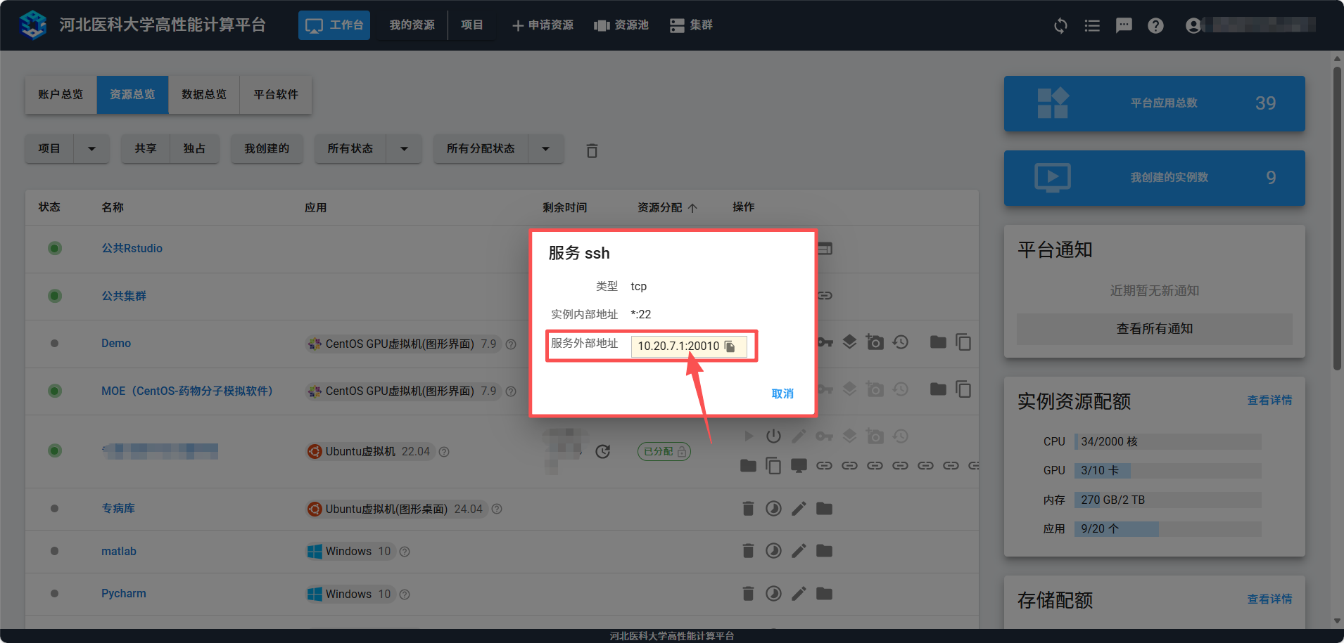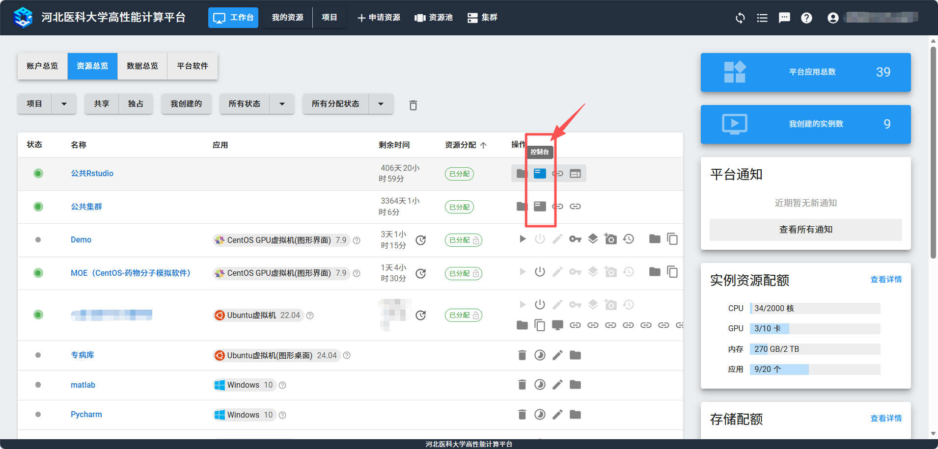 选择所需使用的公共集群,点击如图所示图标,即可登录字符控制台界面