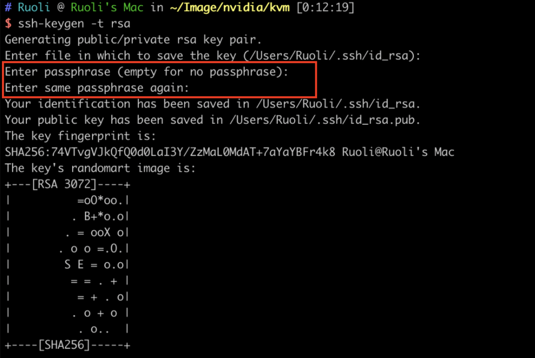 终端会提示输入密码passphrase,这个密码为生成私钥的密码,将来防止私钥被其他人盗用。这里可以不输入任何密码,直接回车,再次提示输入密码,再次回车。