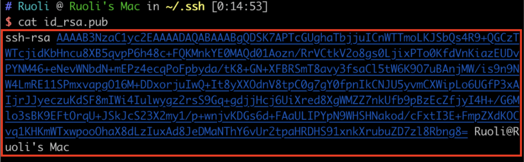 这时公钥存储在 /Users/~your-local-username~/.ssh/id_rsa.pub 文件里,私钥存储在 /Users/~your-local-username~/.ssh/id_rsa 文件里。
