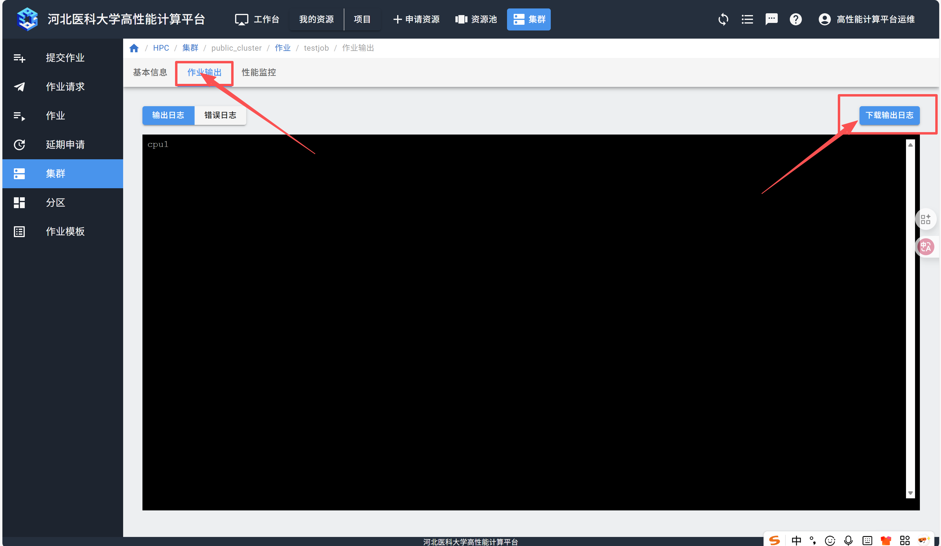 在“作业输出”页面,点击“下载输出日志”。