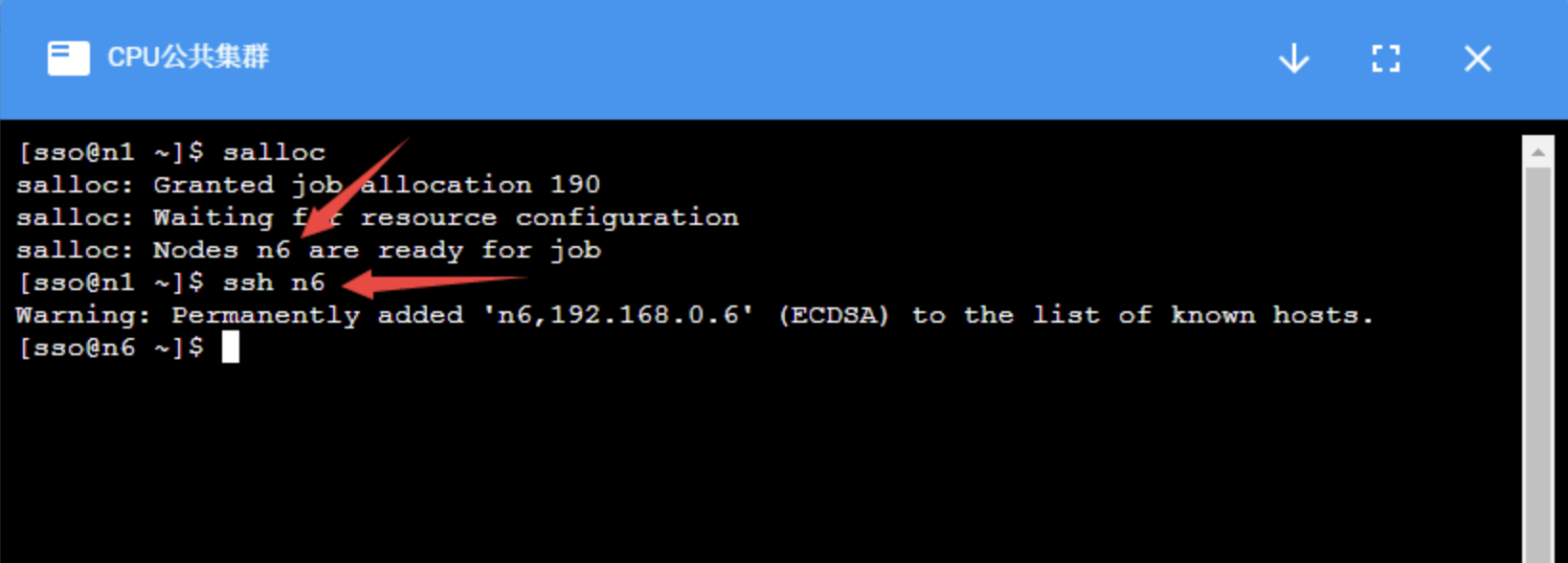 集群的计算节点默认不允许用户直接登录,对需要交互式处理的程序,在登录到集群后,使用salloc命令分配节点,然后再ssh到分配的节点上进行处理: