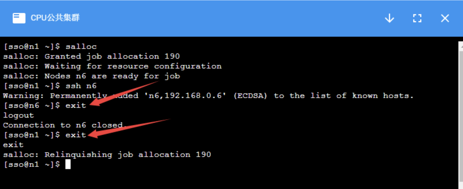 计算完成后,使用:cmd:exit 命令退出节点,注意需要:cmd:exit 两次,第一次exit是从计算节点退出到登录节点,第二次 exit 是释放所申请的资源。