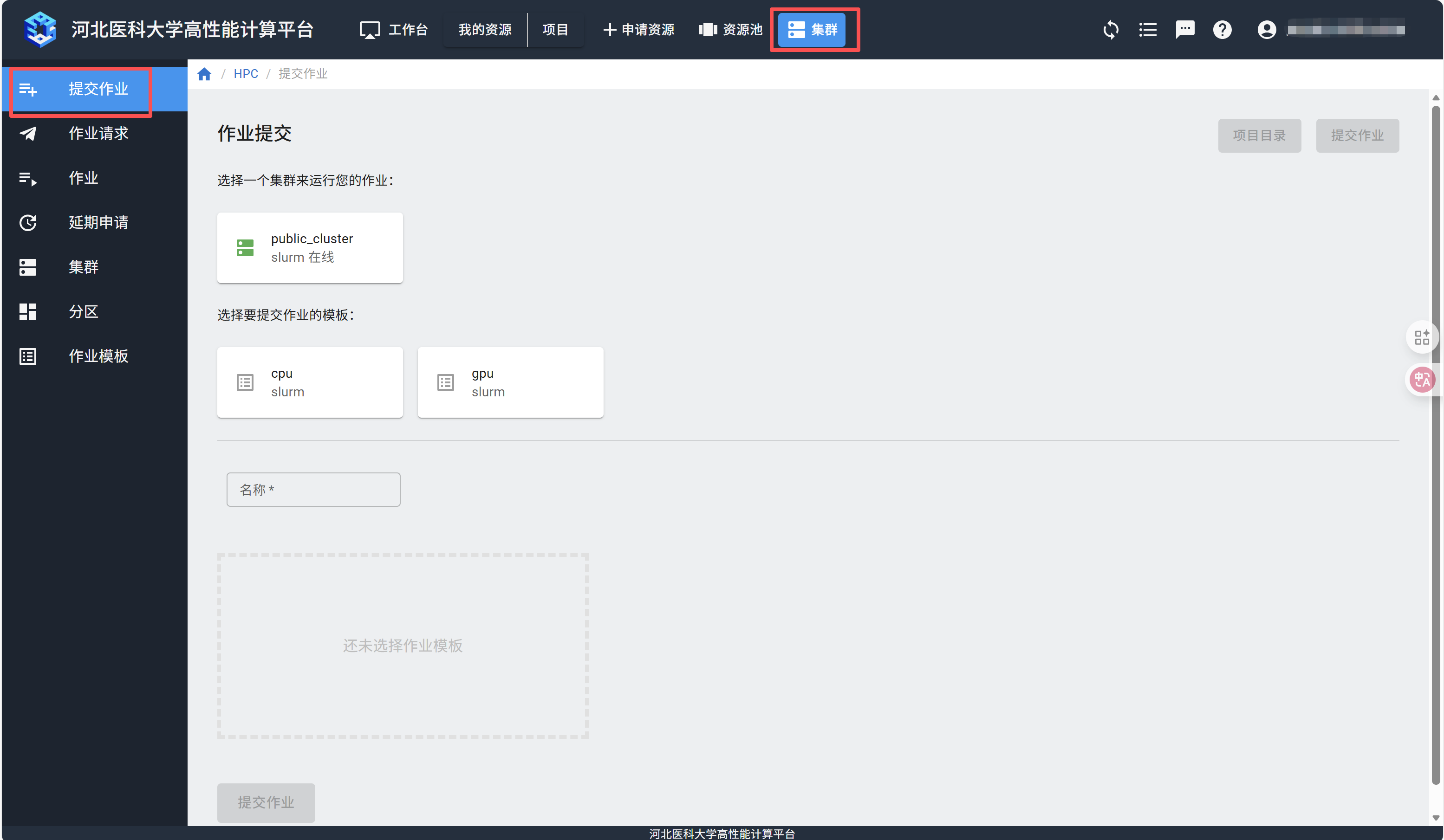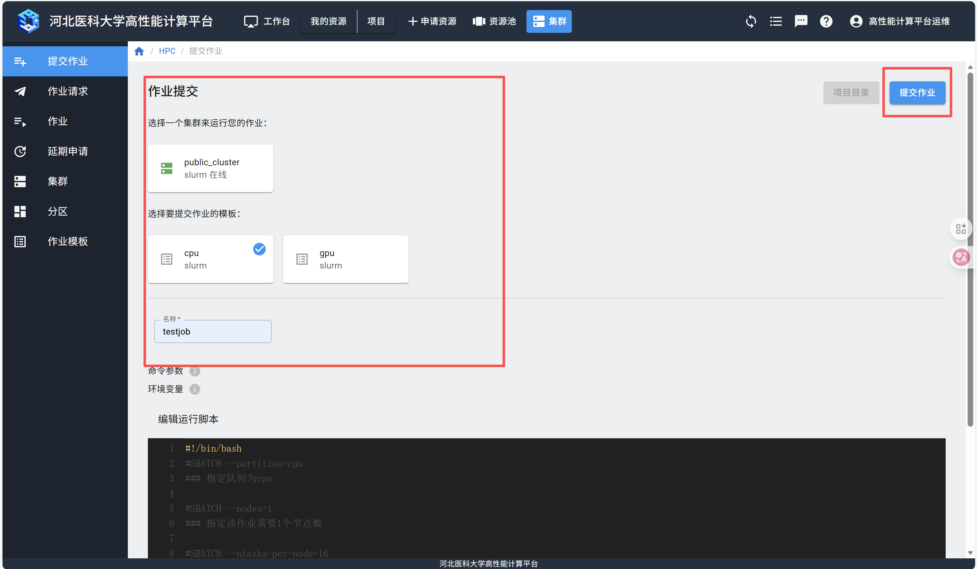 选择需要使用的集群和作业模板,填写作业名称,在脚本编辑器里填入作业脚本,点击右上方的“提交作业”按钮。