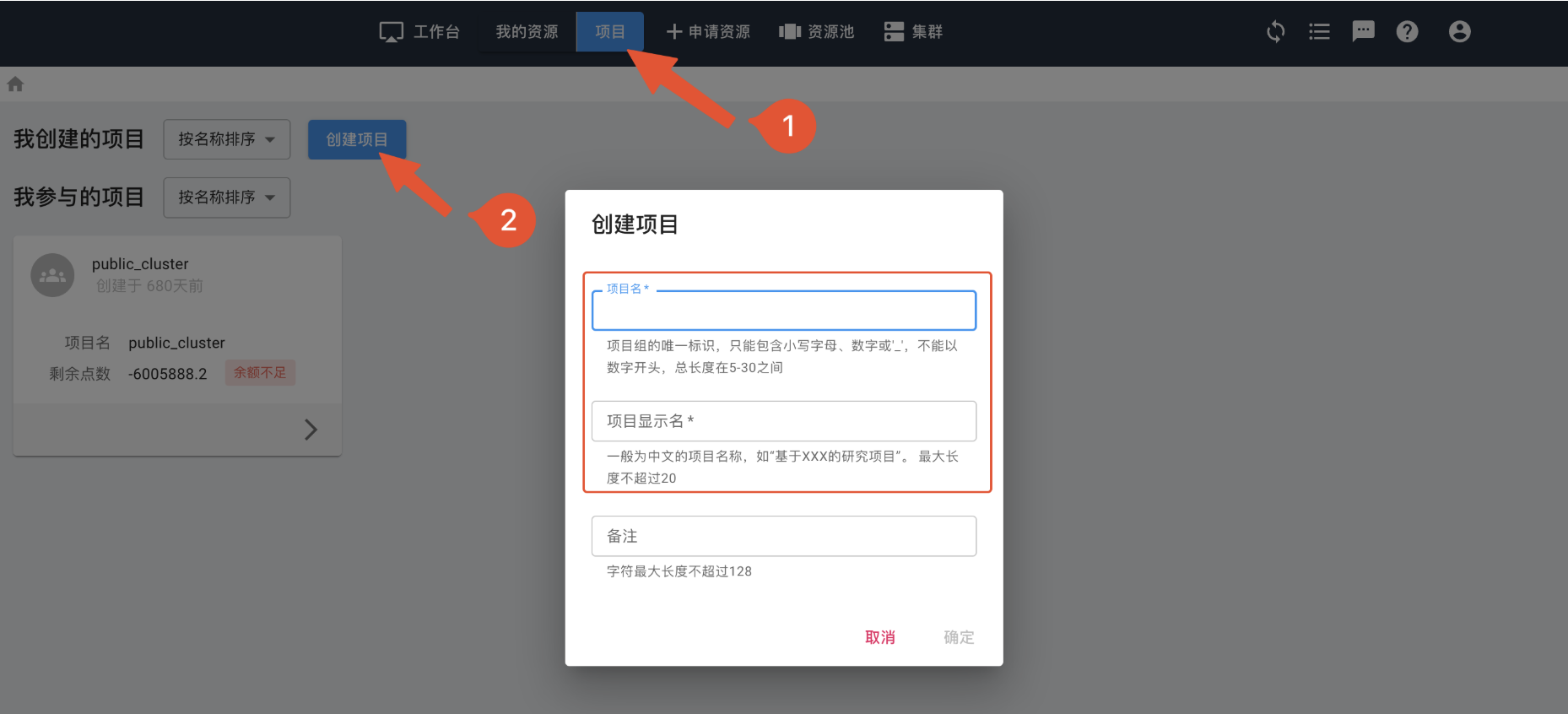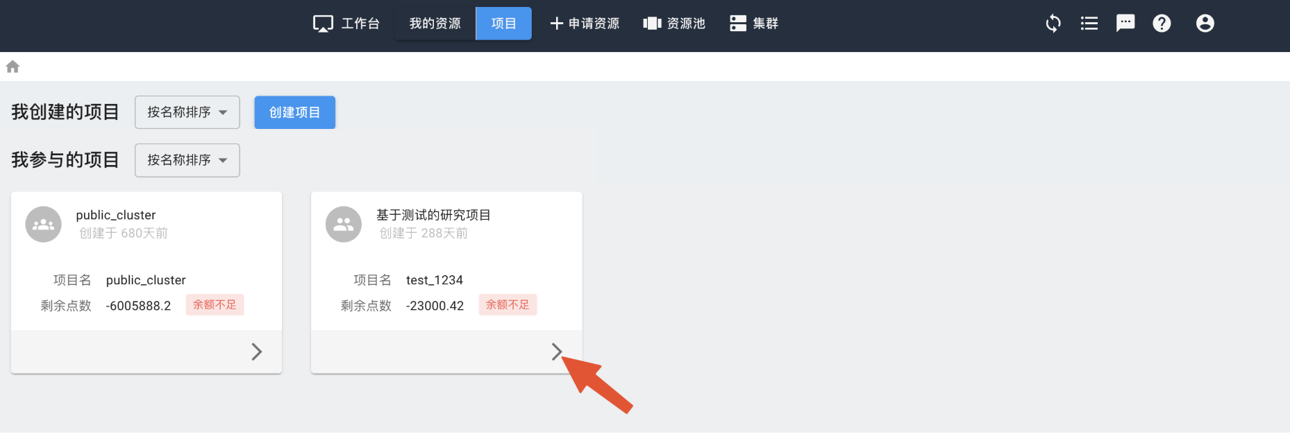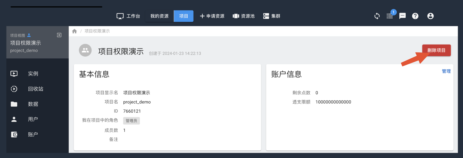 删除项目前,确保已经停止并删除项目内所有实例,移出除管理员外所有成员,且项目账户点数已为0。