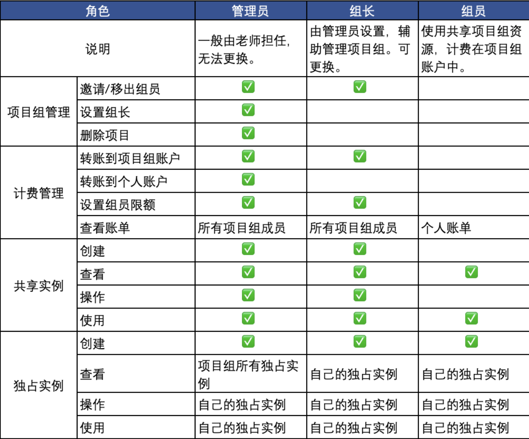 项目组用户分管理员、组长和组员,具体项目组各成员权限参见下表。