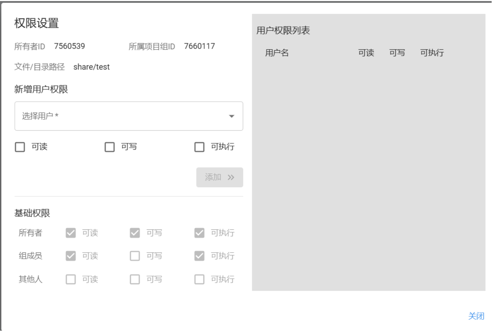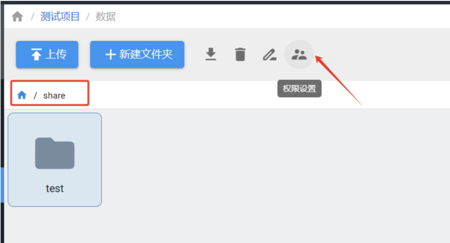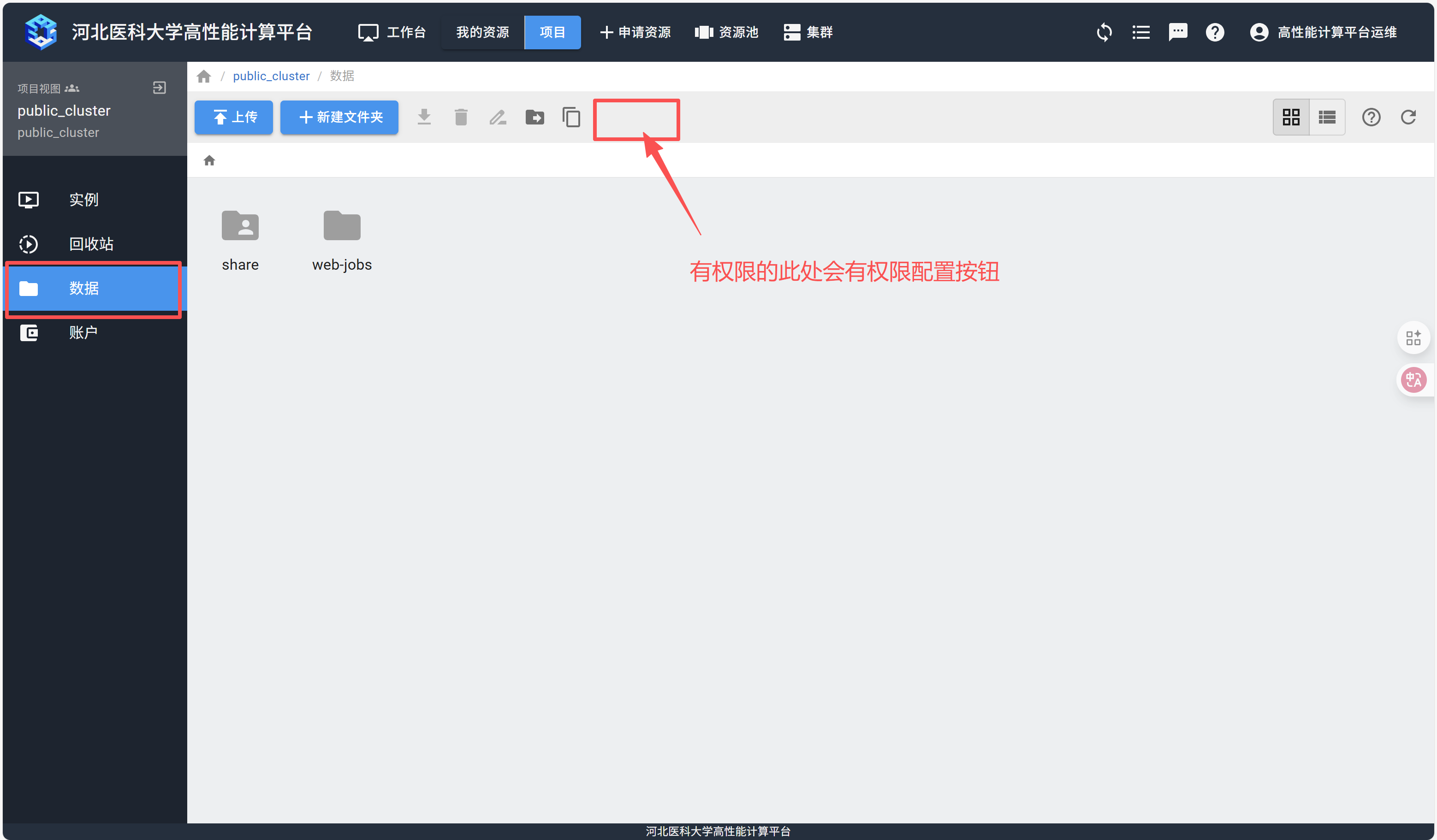 项目管理员可以通过web界面,为项目组share目录下的文件夹配置项目组内成员的权限,包括可读、可写、可执行等。
